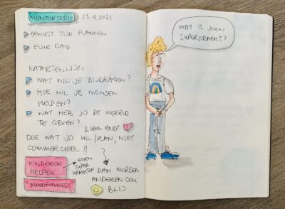 Tijdens een mentorsessie in april 2021 van de Illustratie Expeditie onder leiding van ‘juf’ Femke Veltkamp kwam het antwoord op de vraag “wat heb jij de wereld te geven?” als