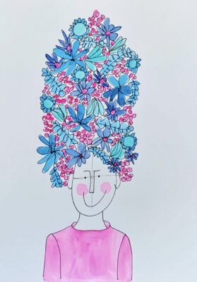 Tijdens de Illustratie Expeditie tekende ik mijn eerste bloemenhoofd in mijn favoriete kleuren: blauw, zeegroen en neon-roze. Ik vond het zo leuk om deze hoofden te tekenen dat ik ze