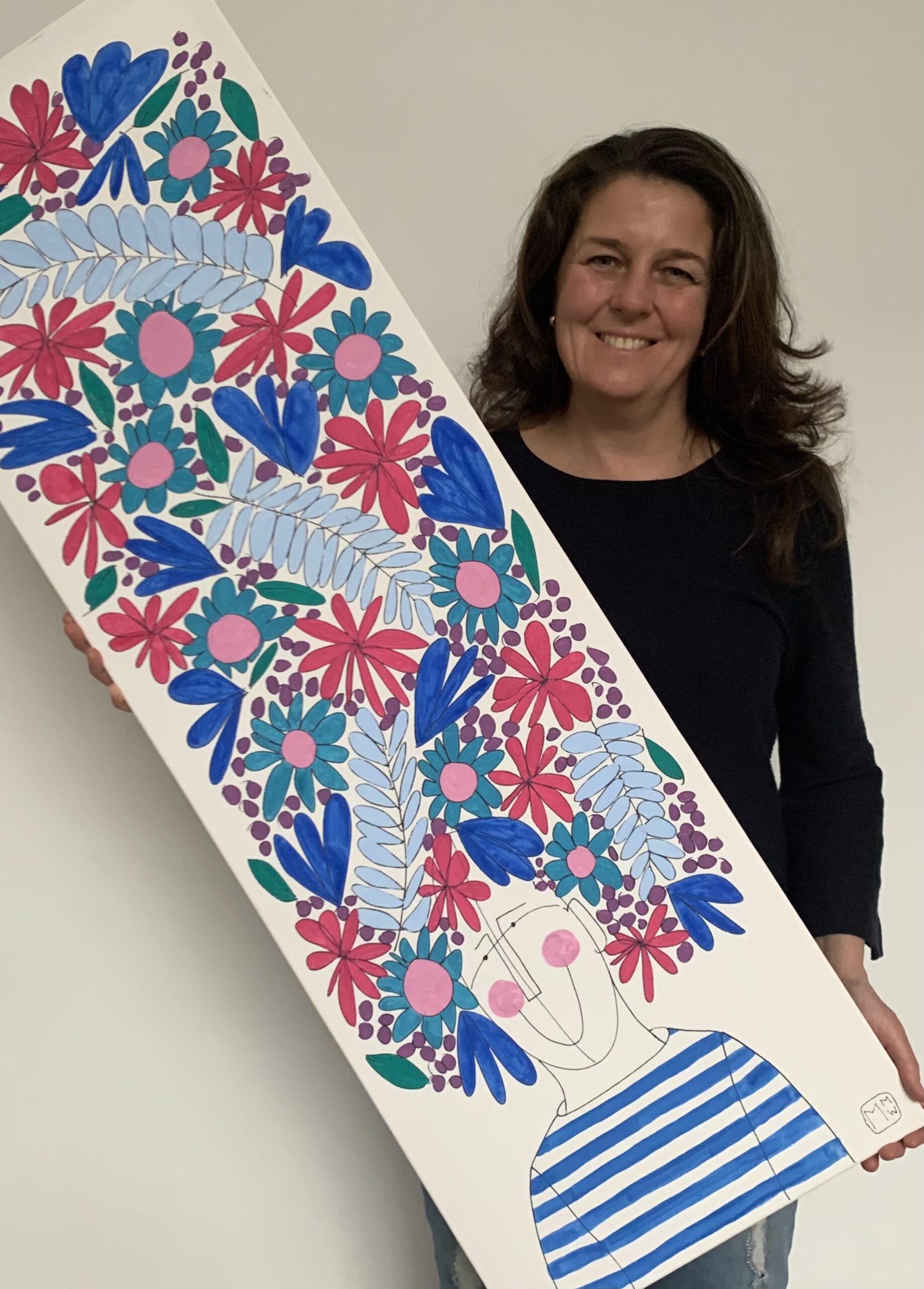 Ik maak ze ook op canvas, in verschillende maten, en maak de basistekening met een dikke(re) zwarte stift. Daarna kleur ik ze in met Posca stiften of gouache, hierdoor kan ik een kleurvaste versie maken die ook in zonlicht niet verkleurd. Dit heb ik een keer fout gedaan en heel veel van geleerd, zie mijn nieuwsbericht van augustus 2022 op mijn website.