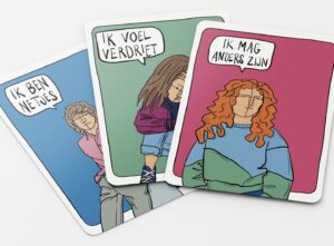 De derde categorie kaarten zijn gevoelskaarten, waarbij zowel de positieve als negatieve gevoelens worden weergegeven. Deze kaarten starten allemaal met de woorden IK VOEL en hebben een groene achtergrond.