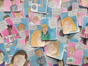 Tijdens de Illustratie Expeditie ontstond het idee voor het helpen van kinderen door middel van een card deck. Mijn eindproject was geboren: een card deck met de naam ‘wat is jouw superkracht?’’. Iedereen heeft zijn eigen superkrachten, vaak heel duidelijk voor anderen en soms wat minder duidelijk voor jezelf. Als je die krachten kan inzetten, gaat alles een beetje makkelijker. Mijn eerste serie kaarten bestond uit vijf superkracht kaarten en vijf trainingskaarten, gemaakt met pen en aquarel op correspondentiekaarten van de Hema.