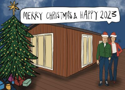 Mijn eerste opdracht voor een bedrijf kreeg ik in 2022, toen het bedrijf Reina Chalets (www.reinachalets.nl) me vroeg om een persoonlijke kaart te maken. Deze kaart wilde ze aan aan een fles bubbels maken, die ze aan de kopers geven bij de verkoop van een chalet. Wat een geweldige opdracht, in Procreate maakte ik de illustratie: een chalet en de eigenaren.