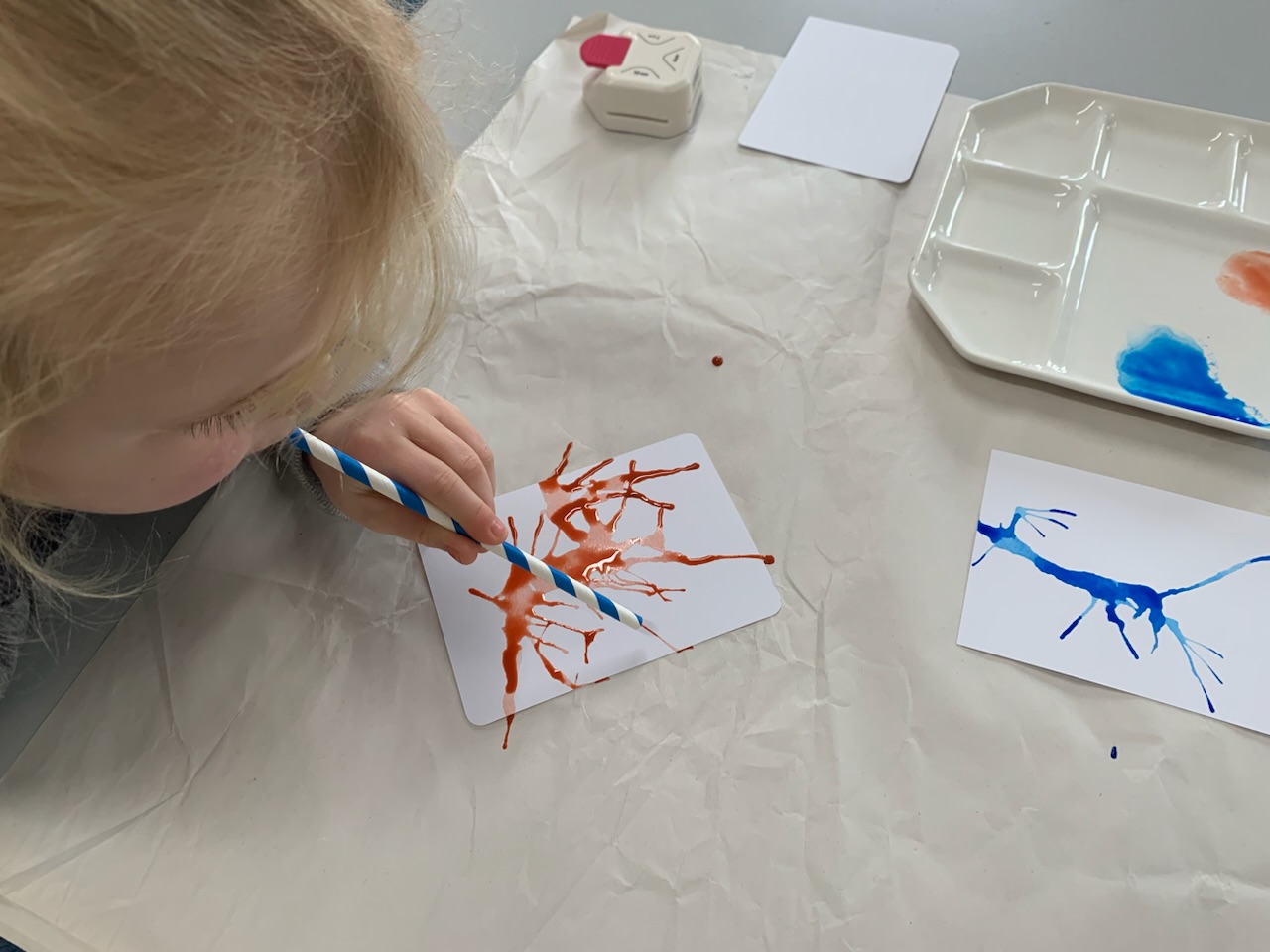Daarna gaan we vlekken uitblazen met een rietje, en terwijl dit droogt een soort zeepbellen maken door met een glas in aquarel te stempelen.